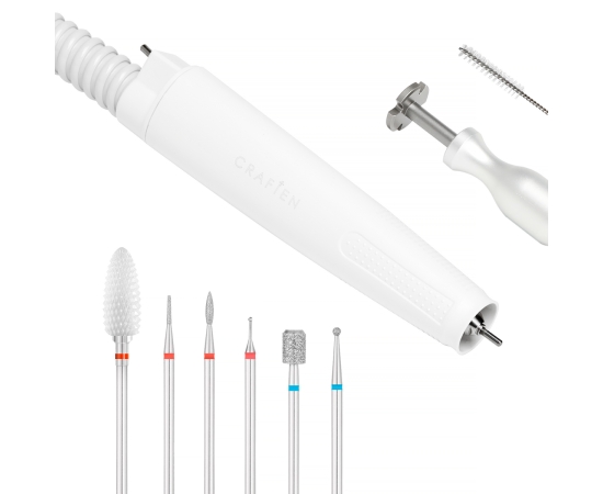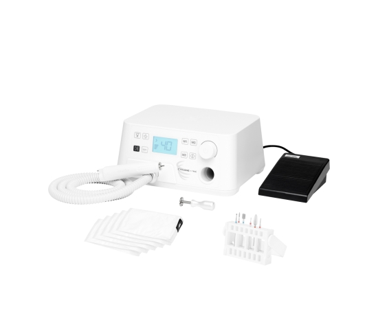 The practical accessories included in the set effectively facilitate the work. A precise head with an absorber and interchangeable filter bags ensure safe use, protecting against inhalation of harmful pathogens. The foot drive allows you to adjust the rotation of the nail drill head during treatments, without using your hands. The kit also includes a set of cutters, that will allow you to comfortably perform a variety of pedicure treatments, and a stand for them made of a special material, which makes it easy to clean. A variety of shapes, materials and gradations of cutters allow you to choose the right tool for the service being performed at the moment and the area being worked on. The included tools for cleaning the head and disassembling the cutters ensure easy maintenance of the device in good condition, making it easier to use.