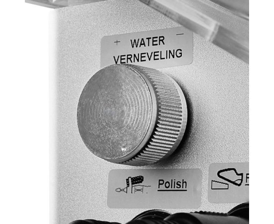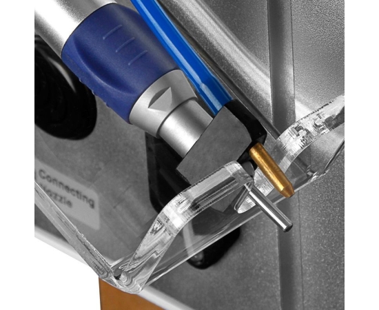 The illuminated liquid container has a capacity of 250 ml. It is very easy to remove, clean, and refill. The fluid will be fed to the hose connected to the other end. The spray connected to the handpiece will be easily accessible during the procedure. Adjust the spray intensity by turning the knob. Switch the spray on or off with the button on the display.