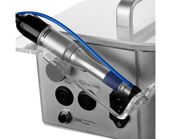 On the left side of the device, there is a bit stand. A handpiece holder is attached to the right side. The foot drive can be connected (you will find it in the box) and used to activate/deactivate the handpiece operation.