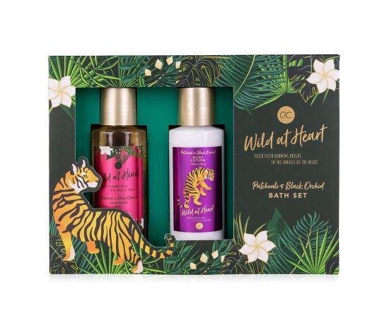 Női ajándék szett, tusfürdő, testápoló, Bath set WILD AT HEART in gift box, 100ml shower gel, 100ml body lotion, fragrance: Patchouli & Black Orchid, col. green/gold/black, kozmetikai szettek