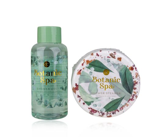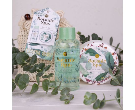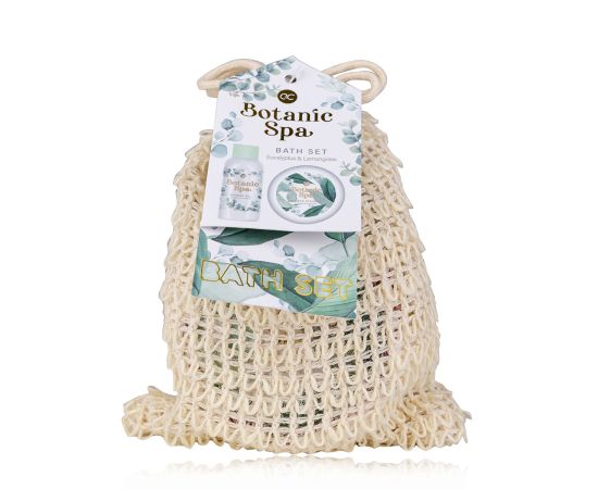 Női ajándék szett, tusfürdő, Zuhany bomba, Bath set BOTANIC SPA in jute bag, 100ml shower gel, 100g Zuhany bomba, fragrance: Eucalyptus & Lemongrass, col. green/white/gold, kozmetikai szettek