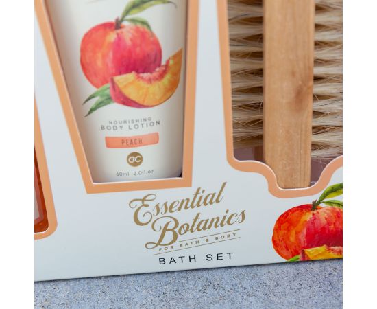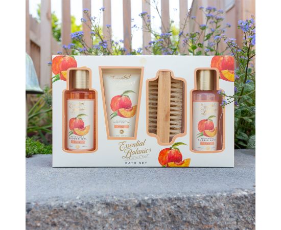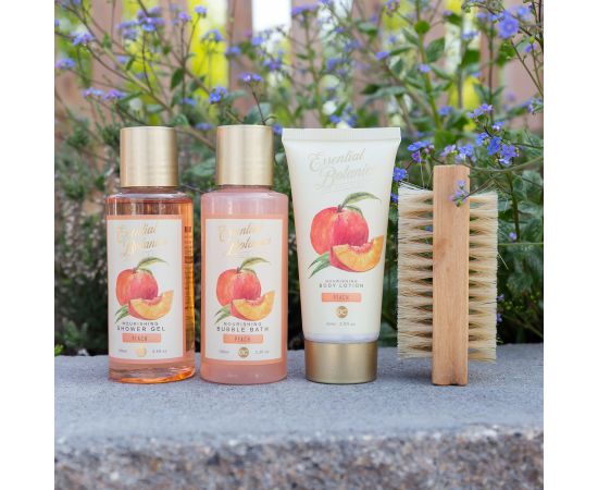 Női ajándék szett, tusfürdő, kézkrém, Körömkefe, habfürdő, Bath set ESSENTIAL BOTANICS - FRUITS in paper gift box, 100ml shower gel, 100ml bubble bath, 60ml body lotion, nail brush, design/fragrance: Peach, kozmetikai szettek