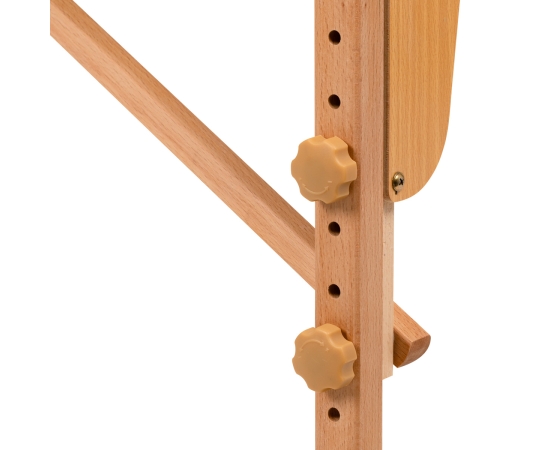 This massage table is made of natural wood and have steel cables as stabilizing elements. The table is stable, does not wobble and does not fold by itself.