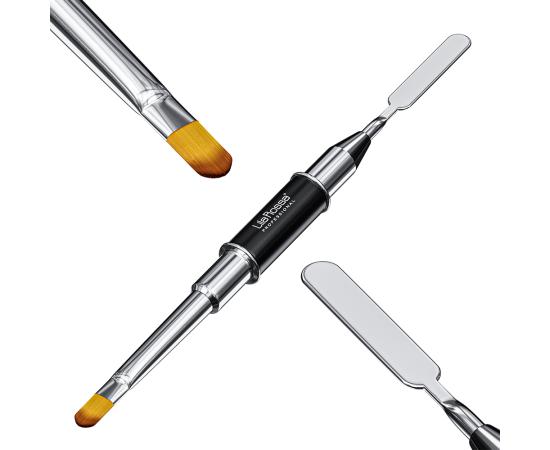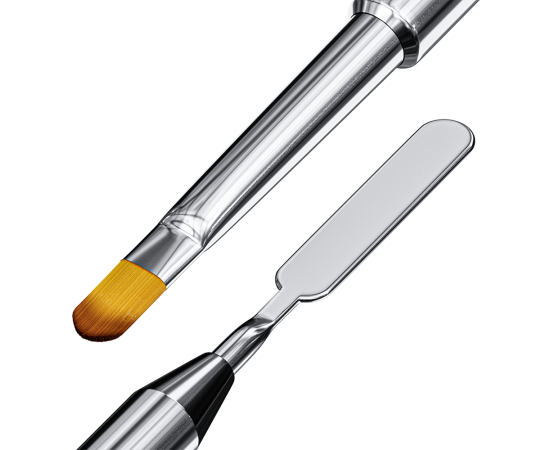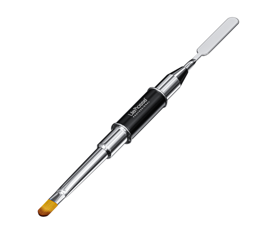 Az egyik vége lehetővé teszi a termék pontos szétterítését és eldolgozását, a másik végén pedig rozsdamentes acélból készült spatula található, ami a következő gélekhez ajánlott: Acryl Gel, Poly Gel vagy One Step Gel.