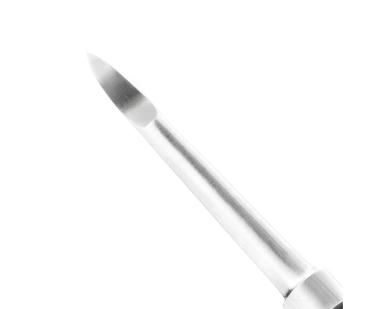 one side with a semicircular end to push cuticles away, the other side with a sharp end for cleaning the edge of the nail.