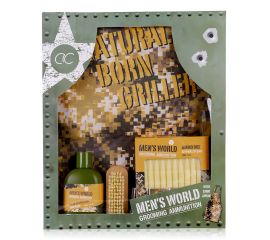 Férfi ajándék szett MEN'S WORLD papír díszdobozban Ideális ajándék férfiaknak. Ötletre van szüksége, hogy lenyűgözzön valakit? Akkor most egy nagyon különleges ajándékot vásárolhat! A készlet tartalma: - tusfürdő 200 ml - szappan 200g - fa körömkefe - "Natural Born Griller"...