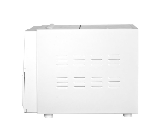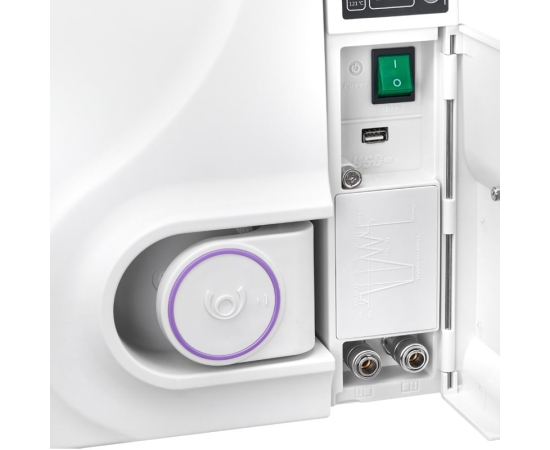 The device is equipped with a control panel with a LED display, which allows the selection of appropriate programs or parameters and keep track of the process. The built-in thermal printer allows confirmation of the sterilisation process to be printed out with information such as: date and time of the cycle, temperature changes, pressure. In addition, there is a connector on the back of the unit that also allows a dedicated printer to be plugged in if required, and the USB input allows sterilisation results to also be saved digitally on the included memory stick. Built-in tanks for distilled and used water significantly improve work. The device has a distilled water quality control function. The self-diagnosis system informs you when an error occurs by displaying appropriate messages, such as about a door not being closed properly or the need to empty the tank or replace the water, which reduces the risk of equipment damage.
